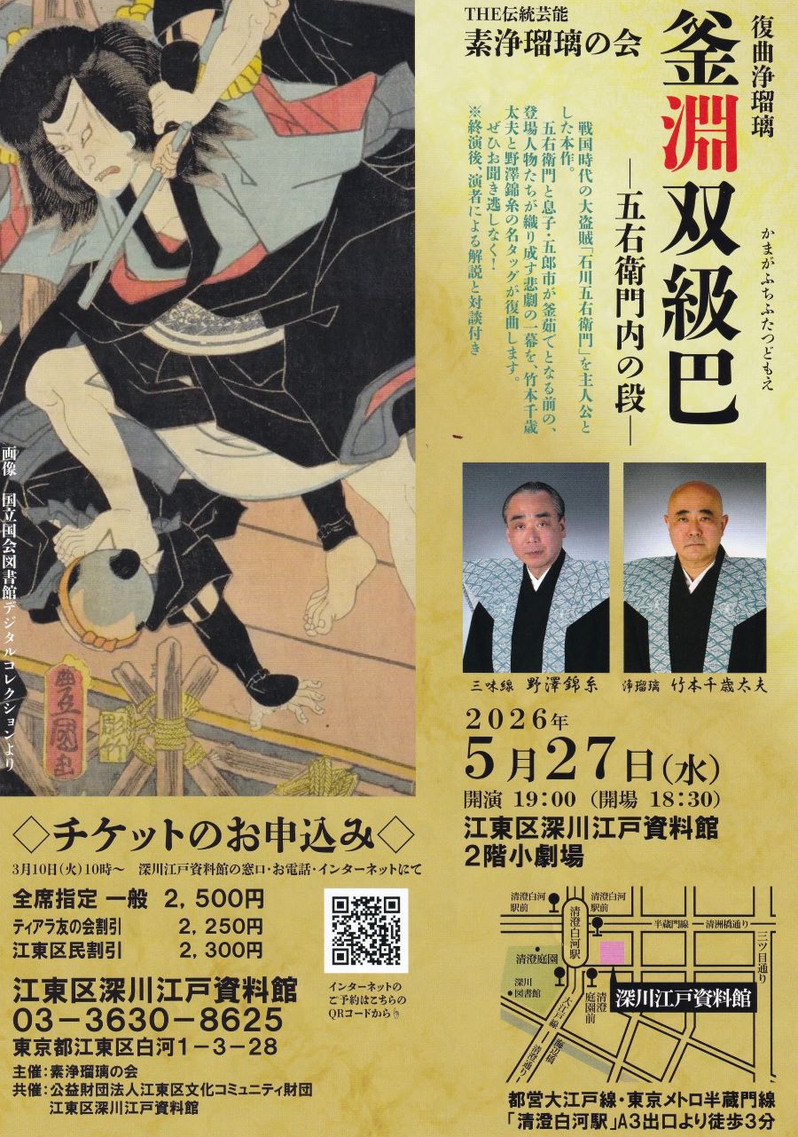 | 26,02,17 | 復曲素浄瑠璃 「釜淵双級巴」〜五右衛門内の段 戦国時代の大盗賊「石川五右衛門」を主人公とした本作。 五右衛門と息子・五郎市が釜茹でとなる前の、登場人物たちが折り返す悲劇の一幕を、竹本千歳太夫と野澤錦糸の名タッグが復曲します。 ぜひお聞き逃しなく! 終演後、演者による解説と対談付き 5月27日(水) 19:00 開演 深川江戸資料館 出演 竹本千歳太夫 野澤錦糸 ちらし |